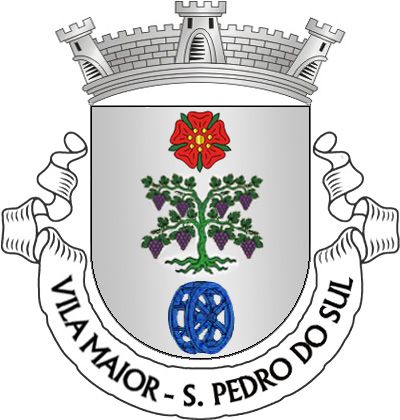 Escudo de prata, uma videira arrancada, folhada e gravinhada de verde, frutada de púrpura, desenvolvendo em faixa; em chefe, uma rosa heráldica de vermelho, botoada a ouro e apontada a verde e, em campanha, roda de azenha azul. Coroa mural de prata de três torres. Listel branco, com a legenda a negro: “VILA MAIOR — S. PEDRO DO SUL”.